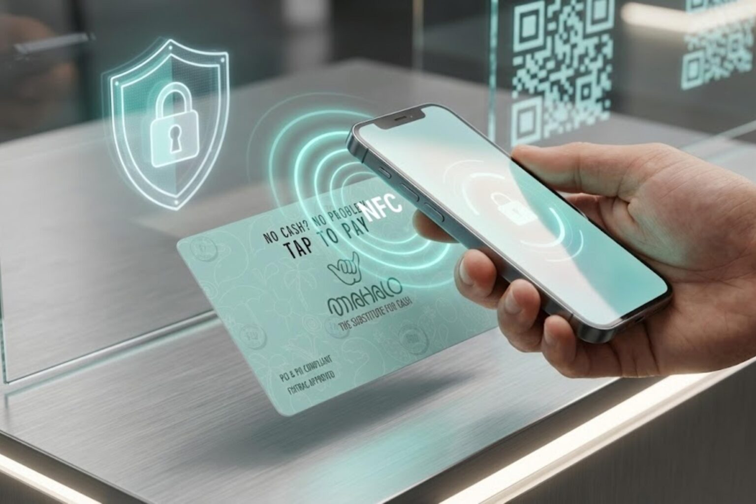 NFC, or Near Field Communication, allows two devices to connect securely when placed very close together. In practice, it means someone can tap their phone on a Mahalo Card or Sticker and make a payment instantly.